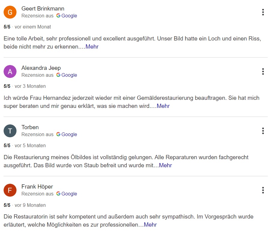 Eine wissenschaftlich-methodische Arbeitsweise, mehrjährige Berufserfahrung und die Berücksichtigung berufsethischer Aspekte ermöglichen mir einen verantwortungsvollen und sicheren Umgang mit Ihrem Kunstwerk.
